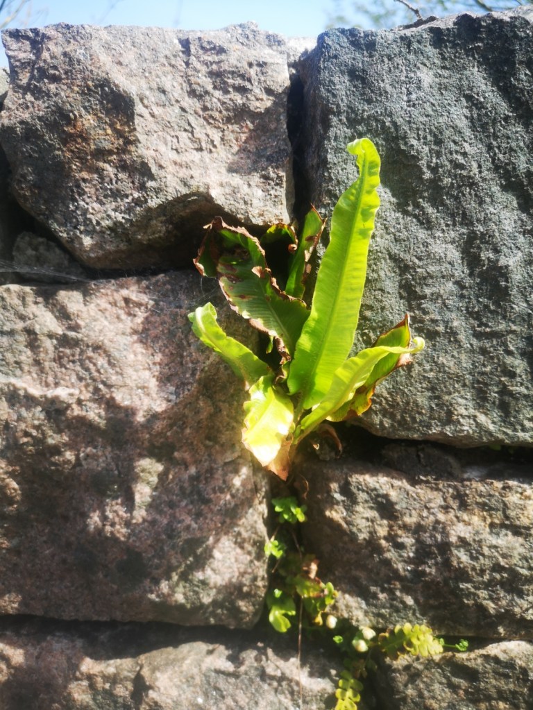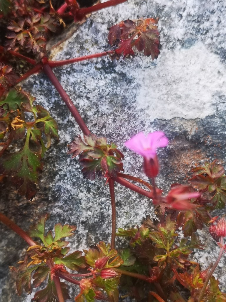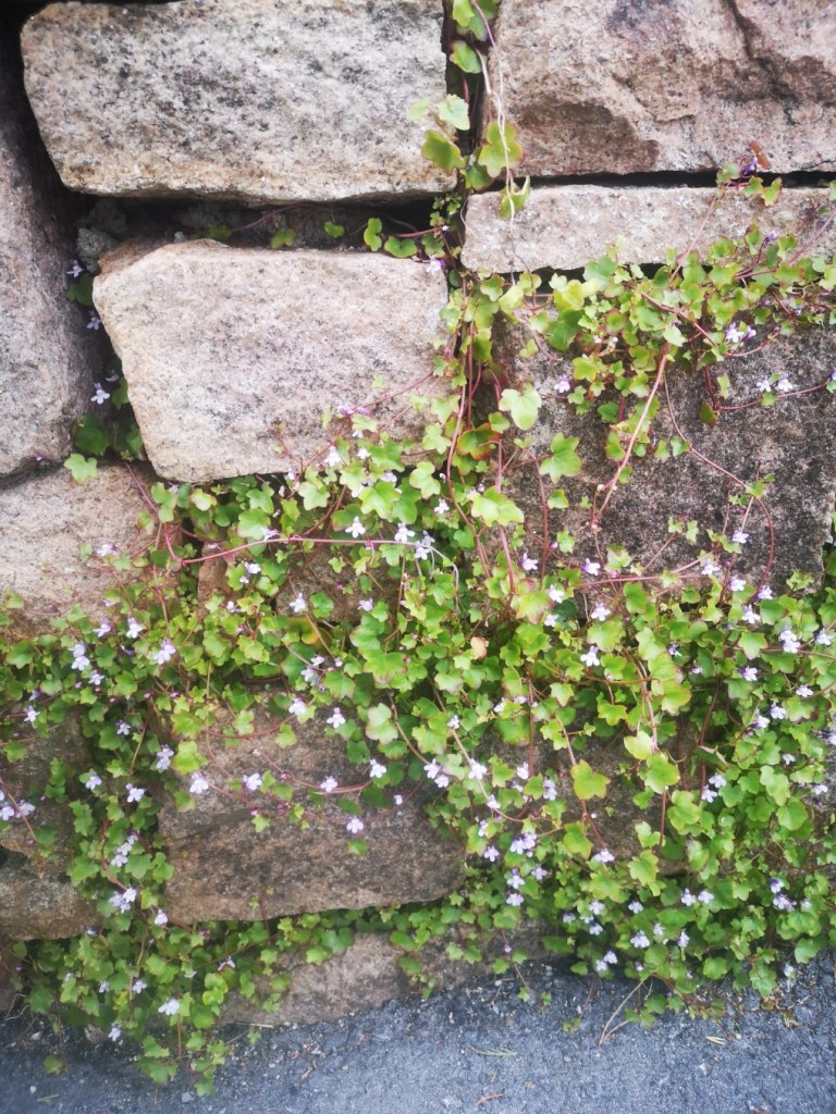 I am staying in Ceathrú Rua, Conamara, Ireland. There are many small, narrow lanes with rock walls on either side. The Irish term in Bóithrín. The walls have many plants growing on them too: ivy-leafed toadflax, polypody fern, ivy, herb-robert, shining crane’s-bill, red valerian, and hart’s tongue. I find it captivating and fear I will be run down by a car as I snap pictures of stone walls. I am always interested in the flora of the country. It is something I do to understand the land.