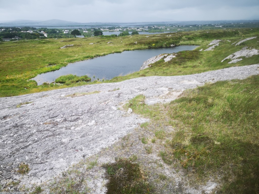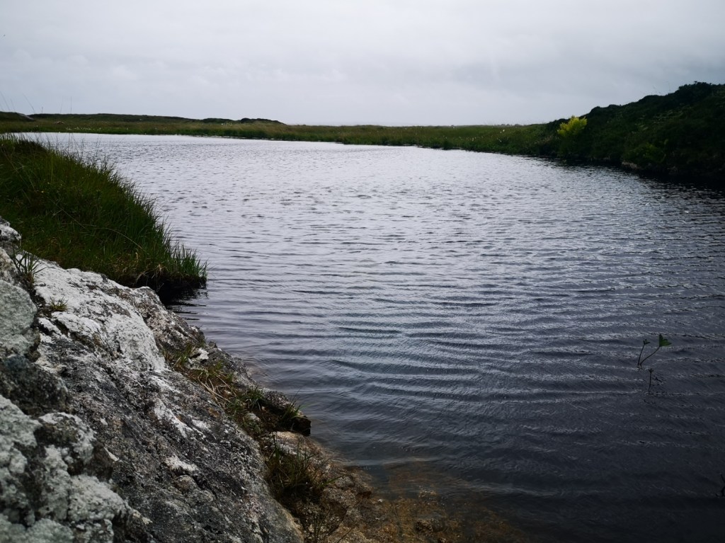 It is always windy there. The lake is on top of a granite hill between An Cheathrú Rua and Galway Bay in Conamara. Few trees, many bogs, low heather and gorse, wonderful wildflowers and orchids. The bedrock is white and can make you think of snow.